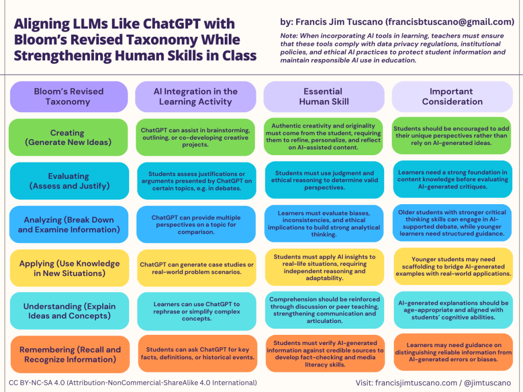 AI is a valuable learning companion but should be used in ways that support competency-based education. Educators must ensure that AI tools enhance, rather than replace, independent thinking, ethical decision-making, and creativity. By designing AI-supported activities that align with Bloom’s Revised Taxonomy, teachers can maximize learning potential while ensuring students build essential cognitive and digital skills. Furthermore, responsible AI use requires educators to ensure that AI tools comply with data privacy regulations, institutional policies, and ethical AI practices, safeguarding student information and fostering a secure learning environment.